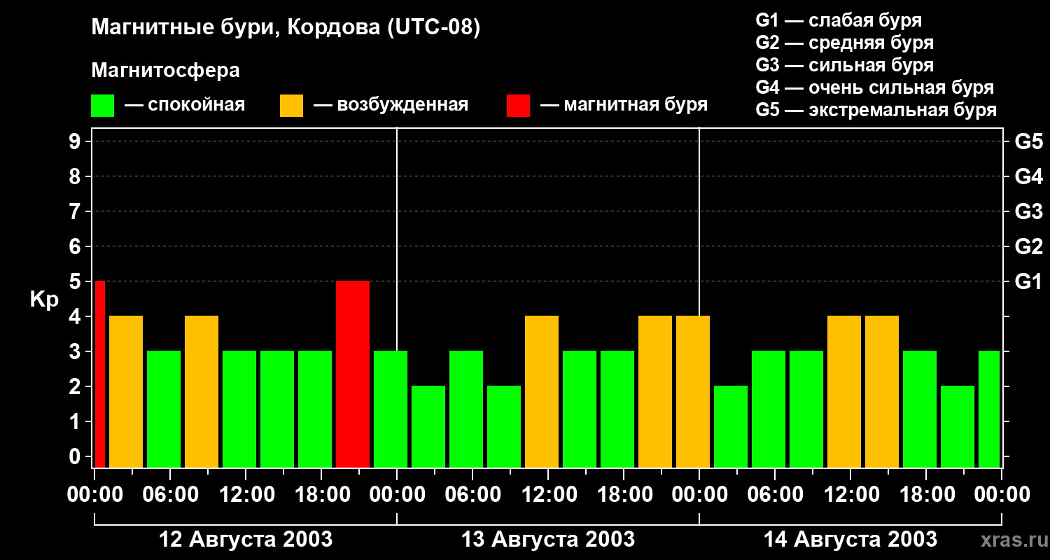 Изменения геомагнитного индекса Kp с 12 по 14 августа 2003 года для средних широт