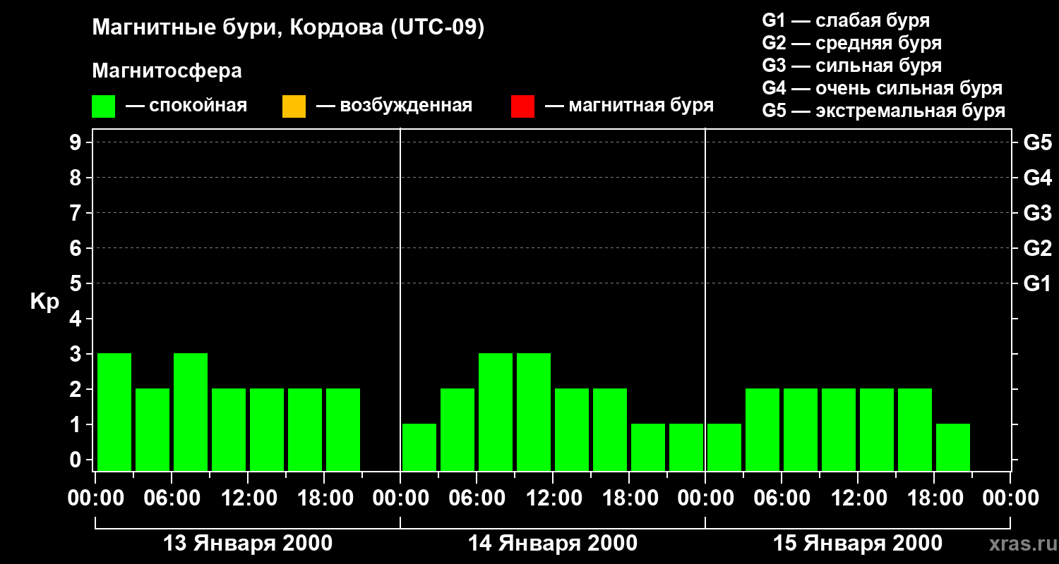 Изменения геомагнитного индекса Kp с 13 по 15 января 2000 года для средних широт