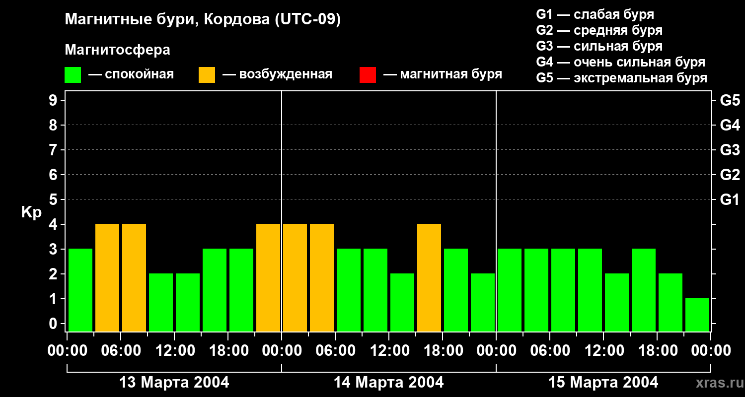 Изменения геомагнитного индекса Kp с 13 по 15 марта 2004 года для средних широт