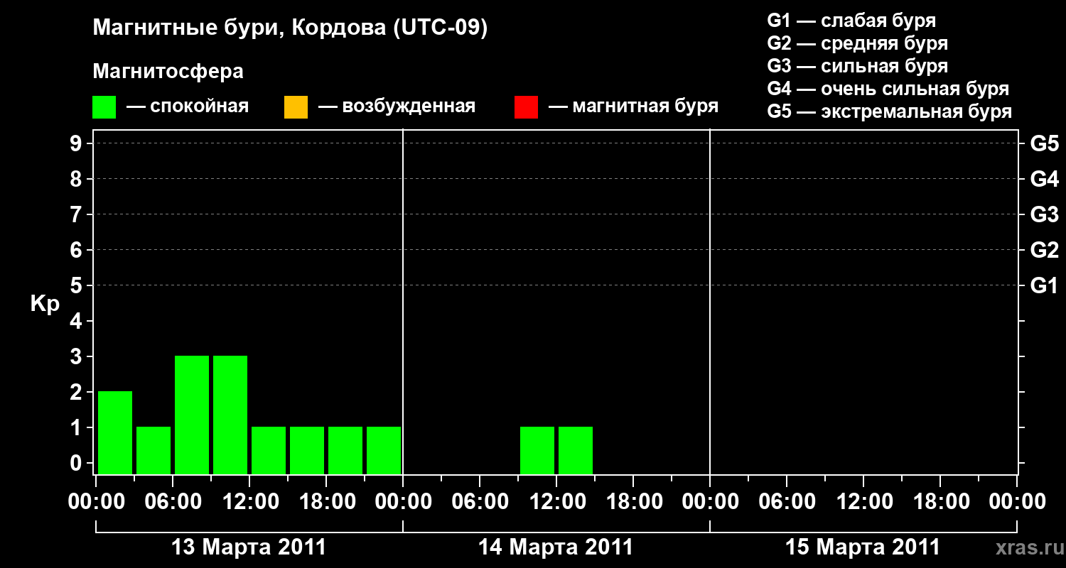 Изменения геомагнитного индекса Kp с 13 по 15 марта 2011 года для средних широт