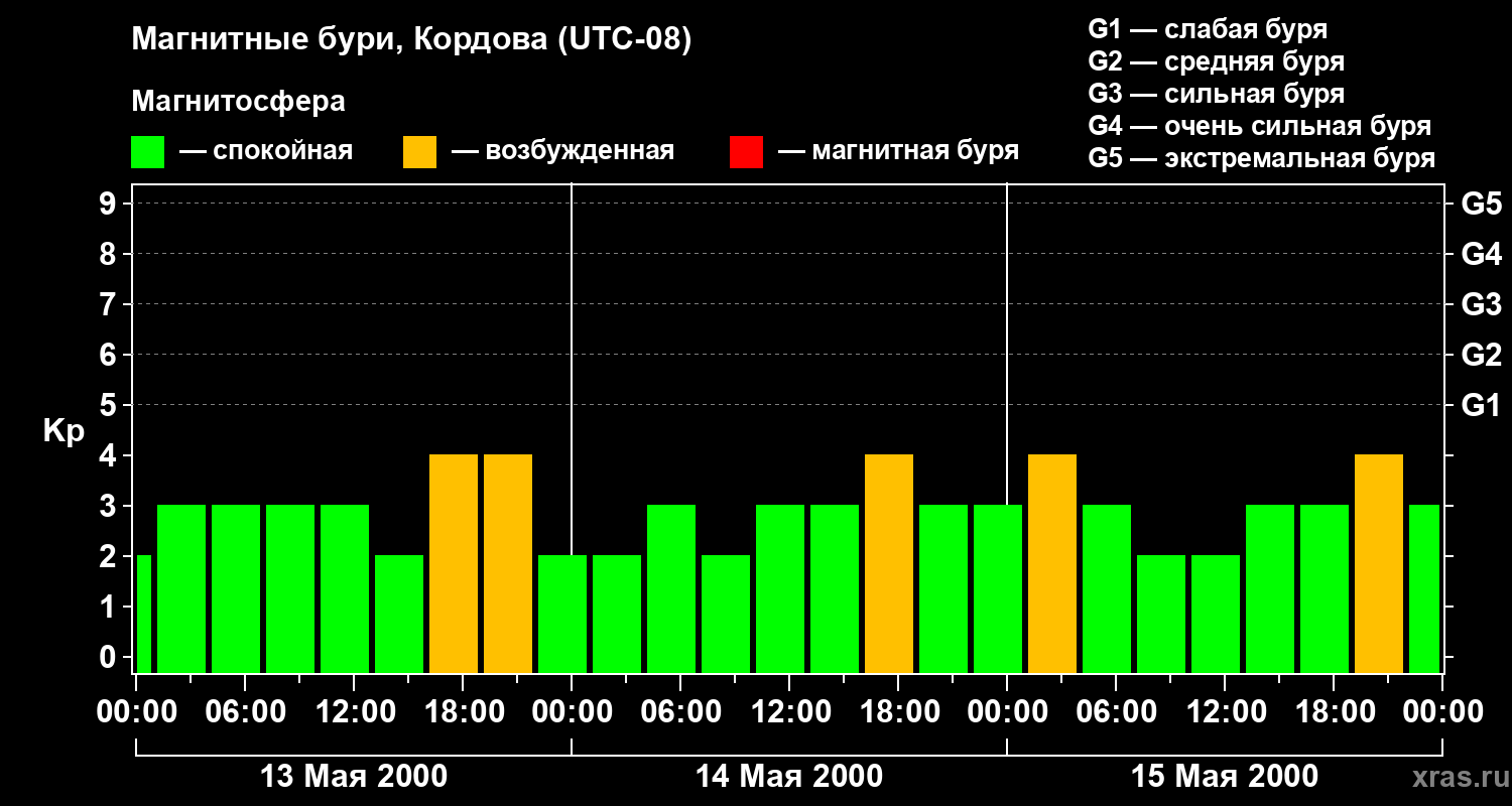 Изменения геомагнитного индекса Kp с 13 по 15 мая 2000 года для средних широт