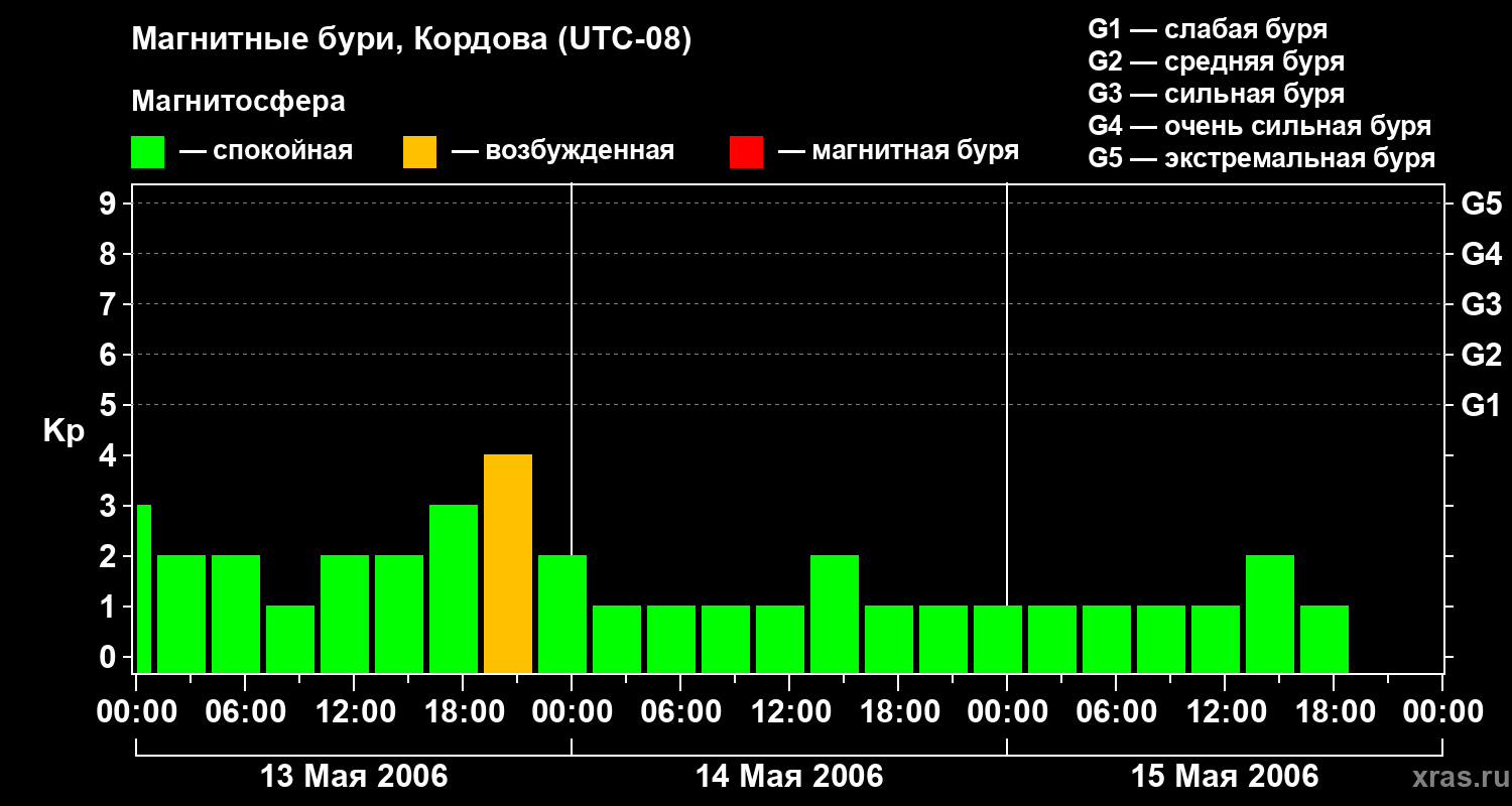 Изменения геомагнитного индекса Kp с 13 по 15 мая 2006 года для средних широт