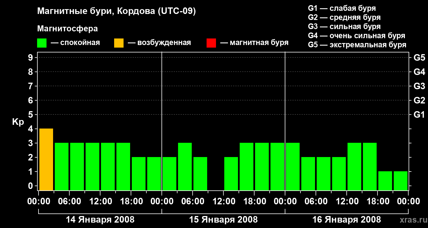 Изменения геомагнитного индекса Kp с 14 по 16 января 2008 года для средних широт
