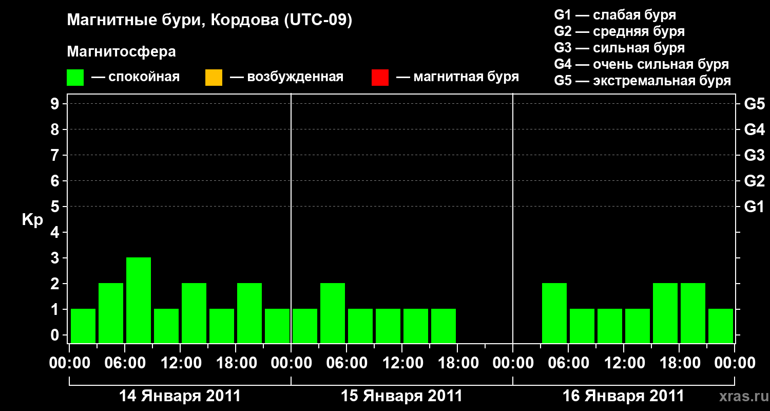 Изменения геомагнитного индекса Kp с 14 по 16 января 2011 года для средних широт