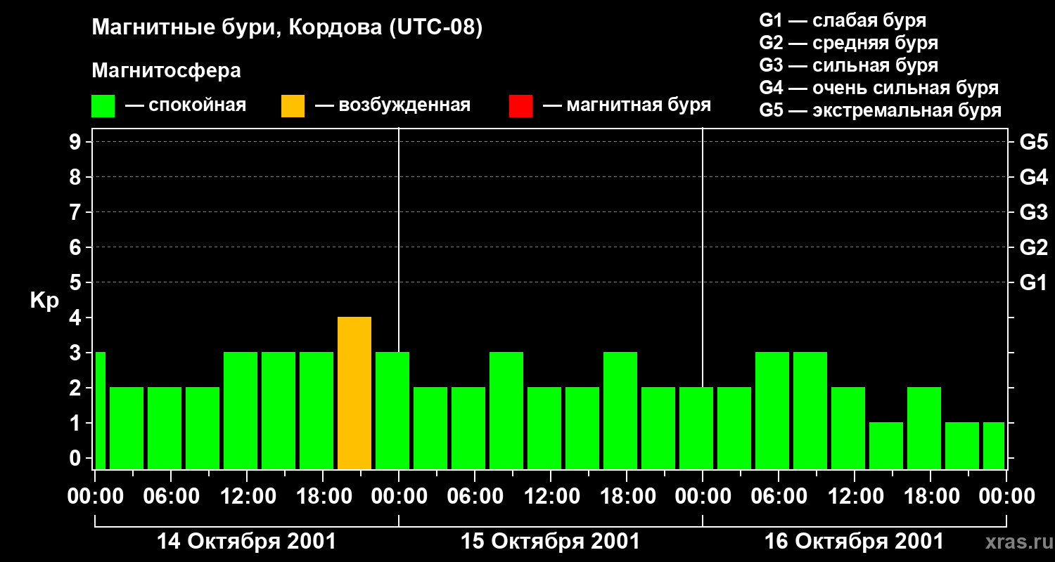 Изменения геомагнитного индекса Kp с 14 по 16 октября 2001 года для средних широт