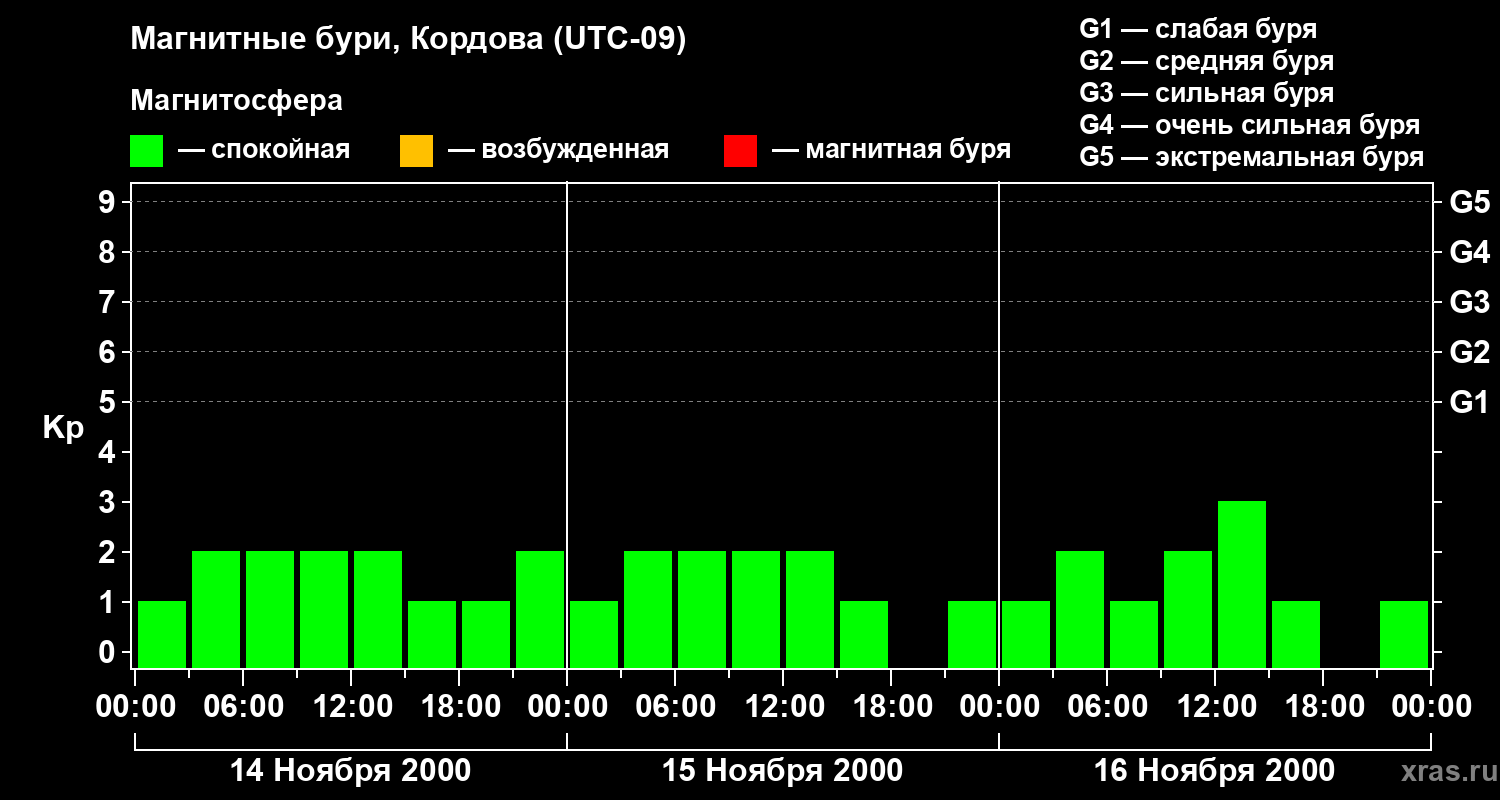 Изменения геомагнитного индекса Kp с 14 по 16 ноября 2000 года для средних широт
