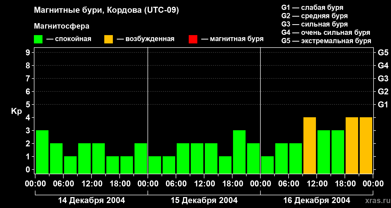 Изменения геомагнитного индекса Kp с 14 по 16 декабря 2004 года для средних широт