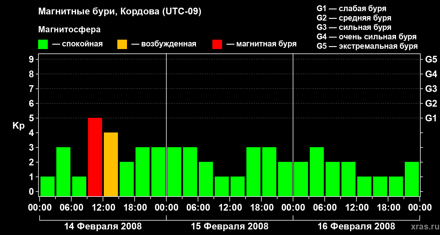 Изменения геомагнитного индекса Kp с 14 по 16 февраля 2008 года для средних широт