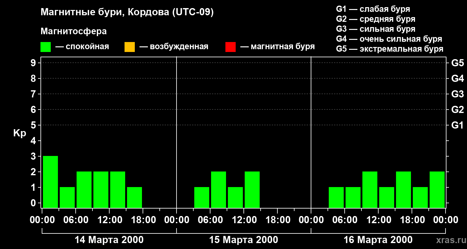 Изменения геомагнитного индекса Kp с 14 по 16 марта 2000 года для средних широт