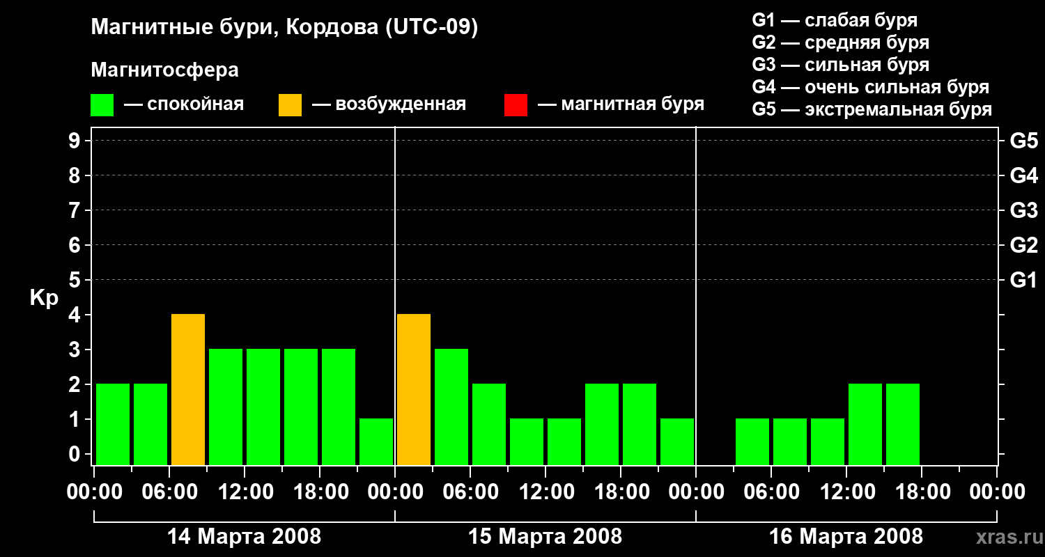 Изменения геомагнитного индекса Kp с 14 по 16 марта 2008 года для средних широт