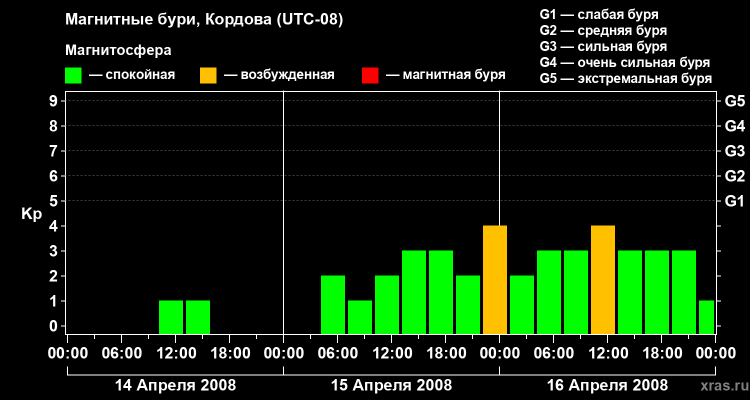 Изменения геомагнитного индекса Kp с 14 по 16 апреля 2008 года для средних широт