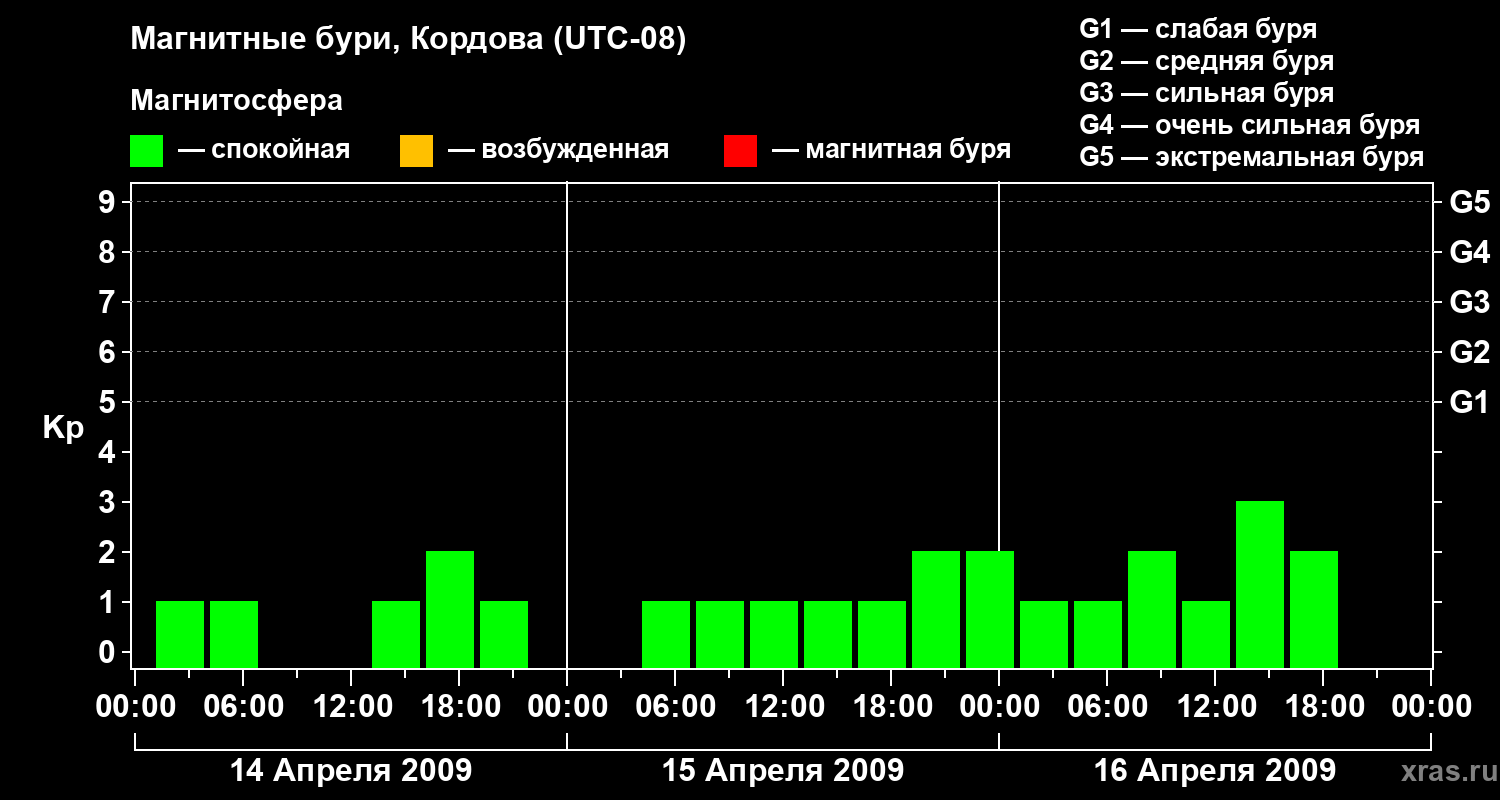 Изменения геомагнитного индекса Kp с 14 по 16 апреля 2009 года для средних широт