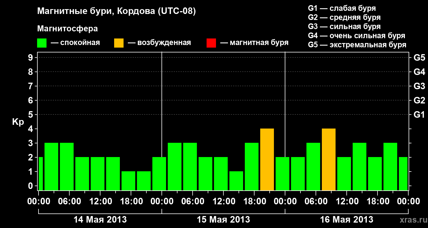 Изменения геомагнитного индекса Kp с 14 по 16 мая 2013 года для средних широт
