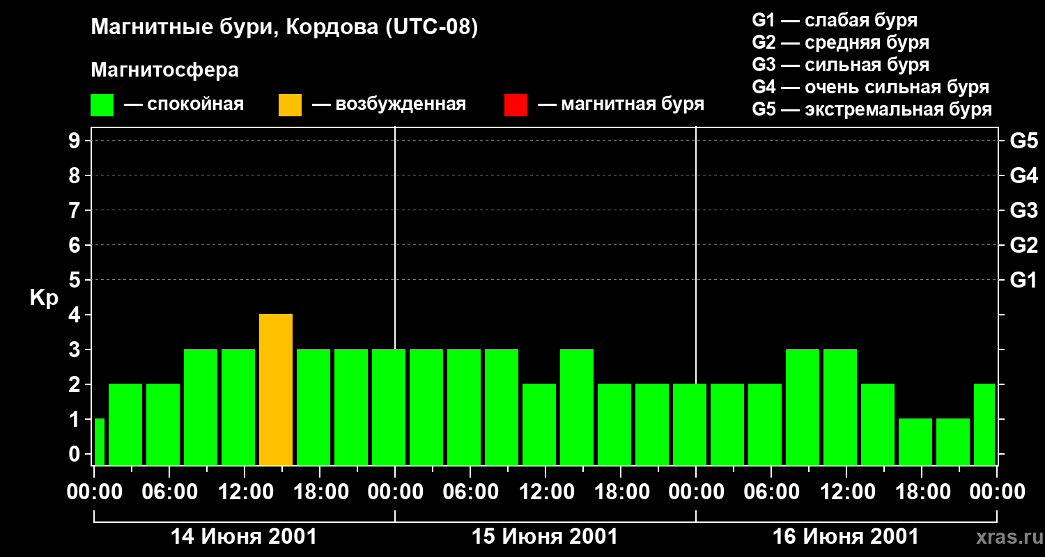 Изменения геомагнитного индекса Kp с 14 по 16 июня 2001 года для средних широт