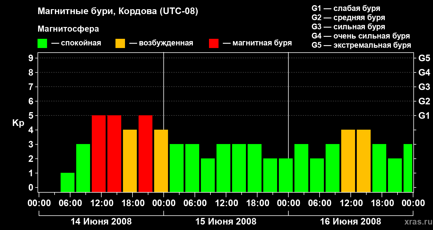 Изменения геомагнитного индекса Kp с 14 по 16 июня 2008 года для средних широт