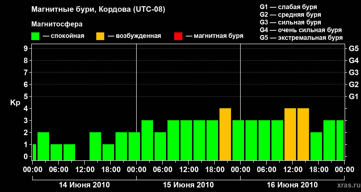 Изменения геомагнитного индекса Kp с 14 по 16 июня 2010 года для средних широт