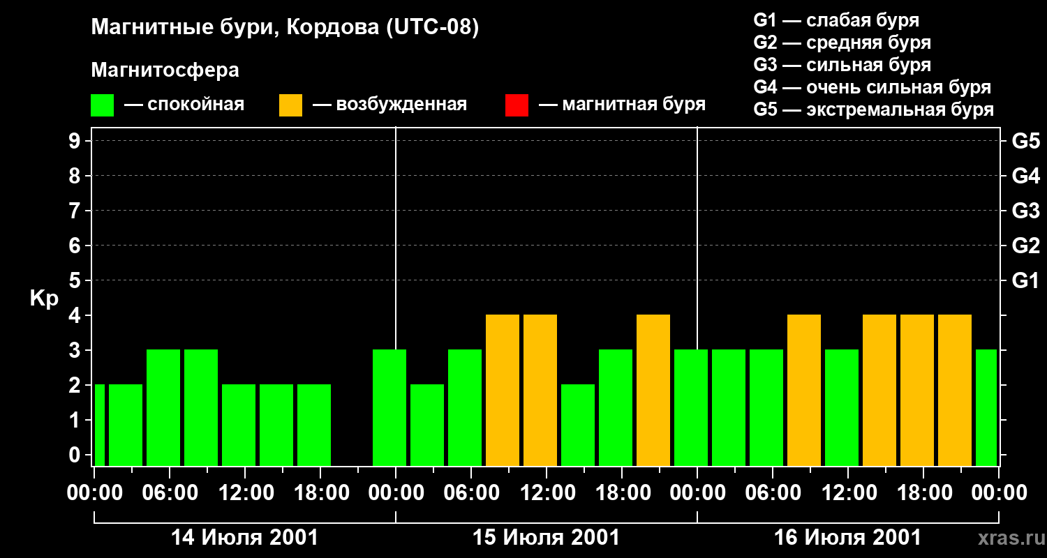 Изменения геомагнитного индекса Kp с 14 по 16 июля 2001 года для средних широт