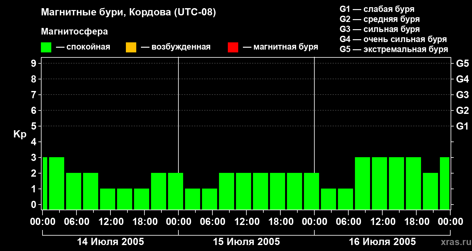 Изменения геомагнитного индекса Kp с 14 по 16 июля 2005 года для средних широт
