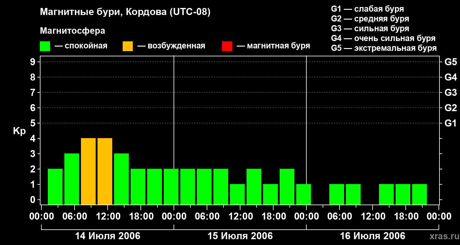 Изменения геомагнитного индекса Kp с 14 по 16 июля 2006 года для средних широт