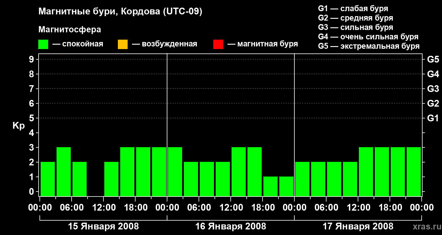 Изменения геомагнитного индекса Kp с 15 по 17 января 2008 года для средних широт