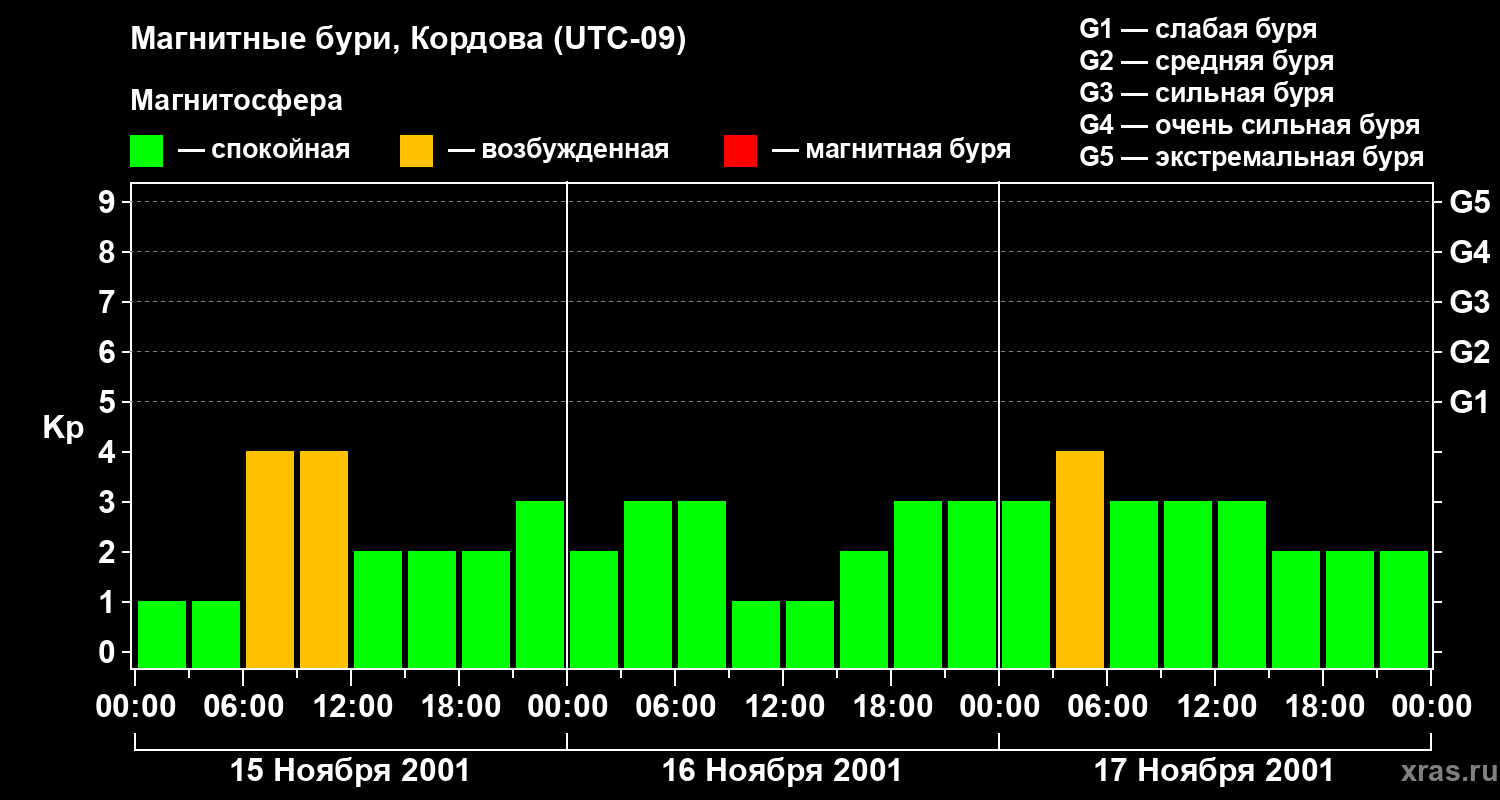 Изменения геомагнитного индекса Kp с 15 по 17 ноября 2001 года для средних широт