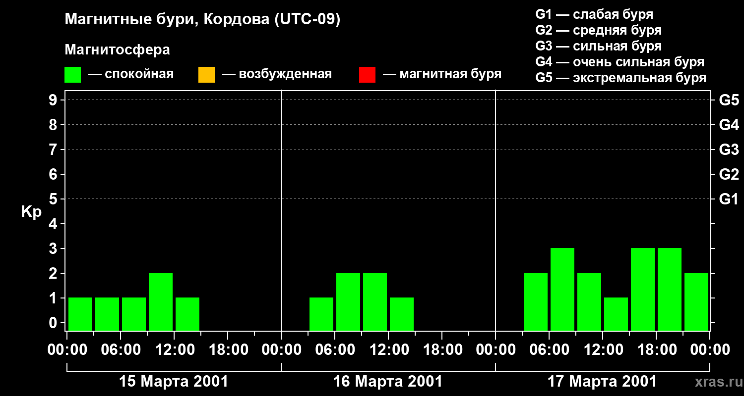 Изменения геомагнитного индекса Kp с 15 по 17 марта 2001 года для средних широт