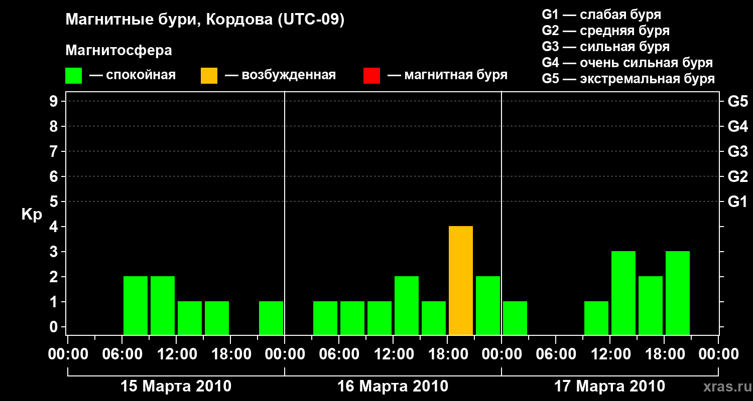 Изменения геомагнитного индекса Kp с 15 по 17 марта 2010 года для средних широт