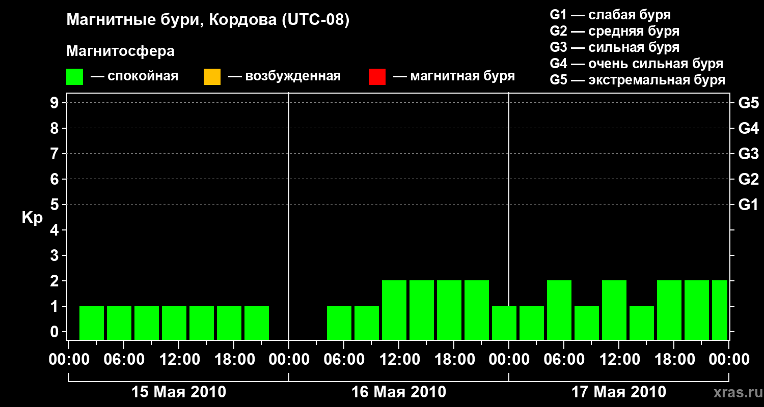 Изменения геомагнитного индекса Kp с 15 по 17 мая 2010 года для средних широт