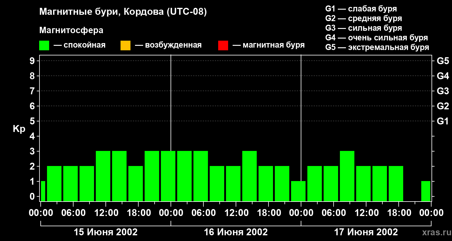 Изменения геомагнитного индекса Kp с 15 по 17 июня 2002 года для средних широт