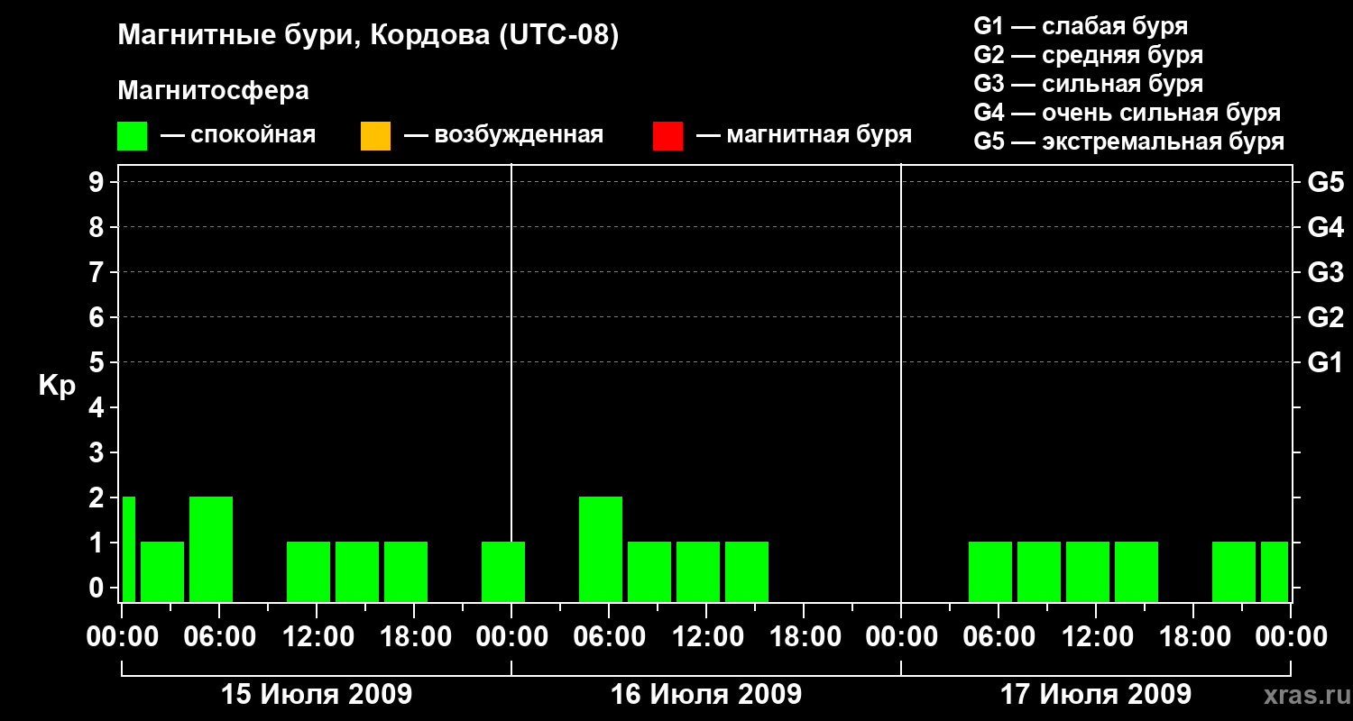 Изменения геомагнитного индекса Kp с 15 по 17 июля 2009 года для средних широт