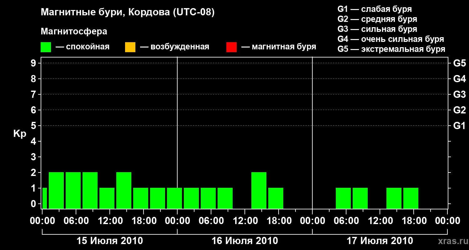 Изменения геомагнитного индекса Kp с 15 по 17 июля 2010 года для средних широт