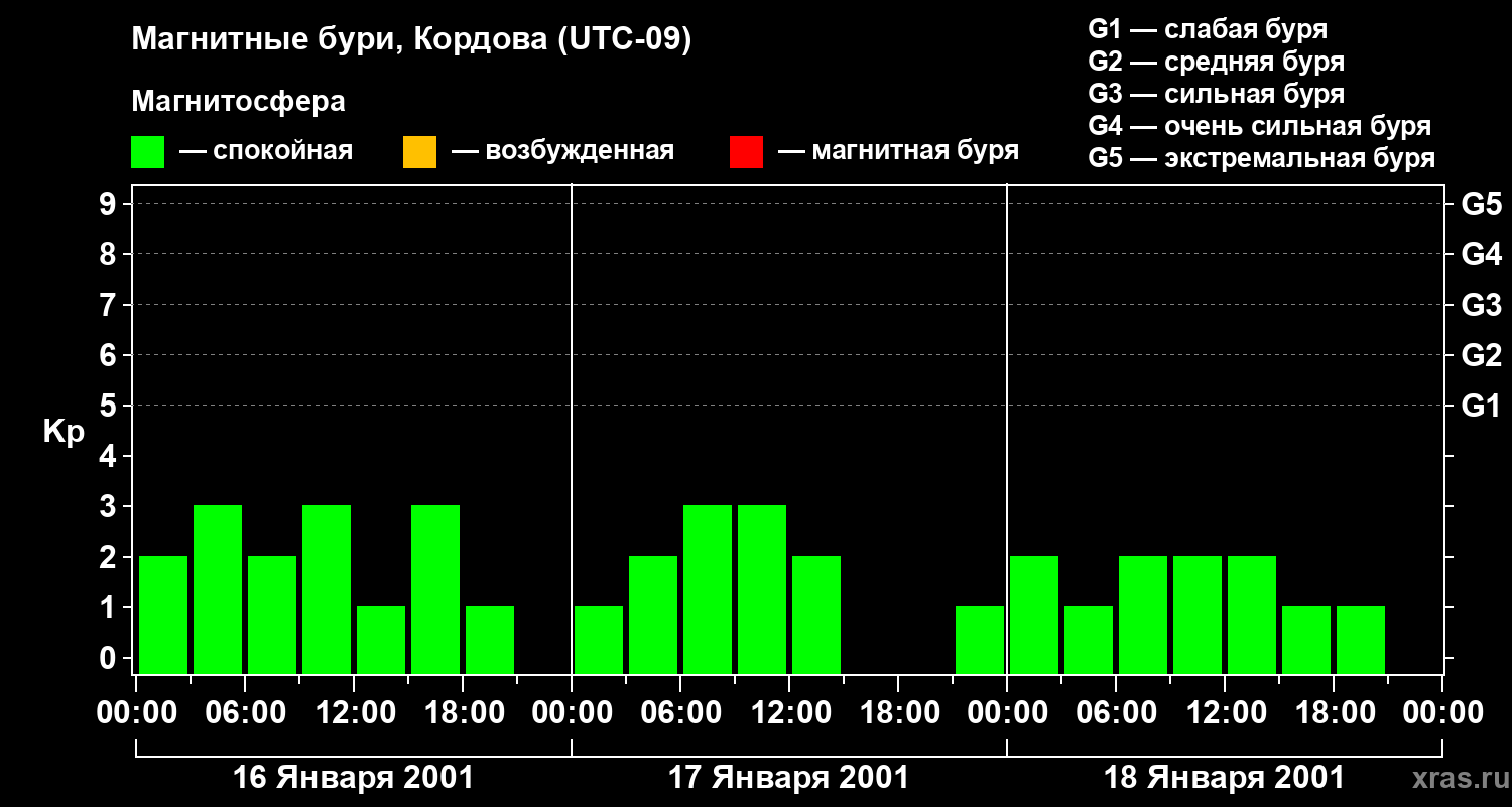 Изменения геомагнитного индекса Kp с 16 по 18 января 2001 года для средних широт