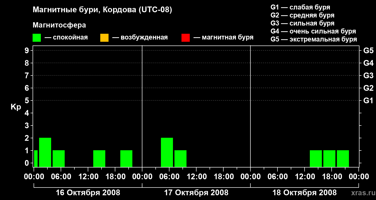 Изменения геомагнитного индекса Kp с 16 по 18 октября 2008 года для средних широт
