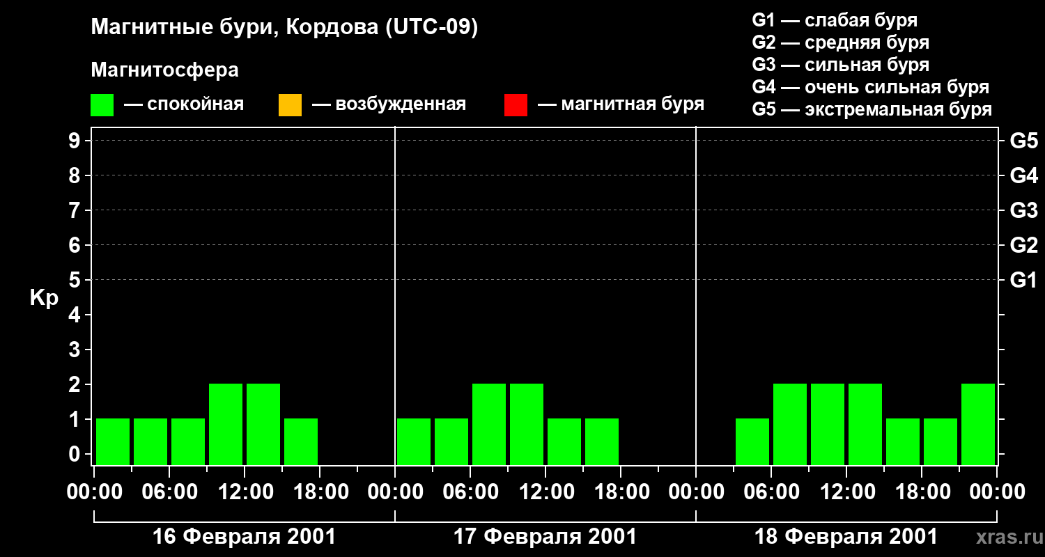 Изменения геомагнитного индекса Kp с 16 по 18 февраля 2001 года для средних широт