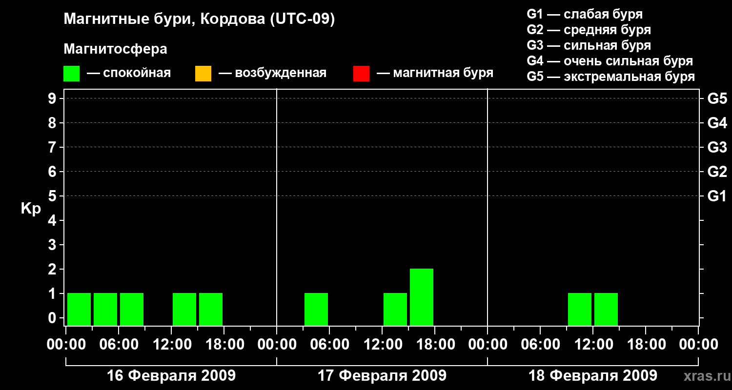 Изменения геомагнитного индекса Kp с 16 по 18 февраля 2009 года для средних широт