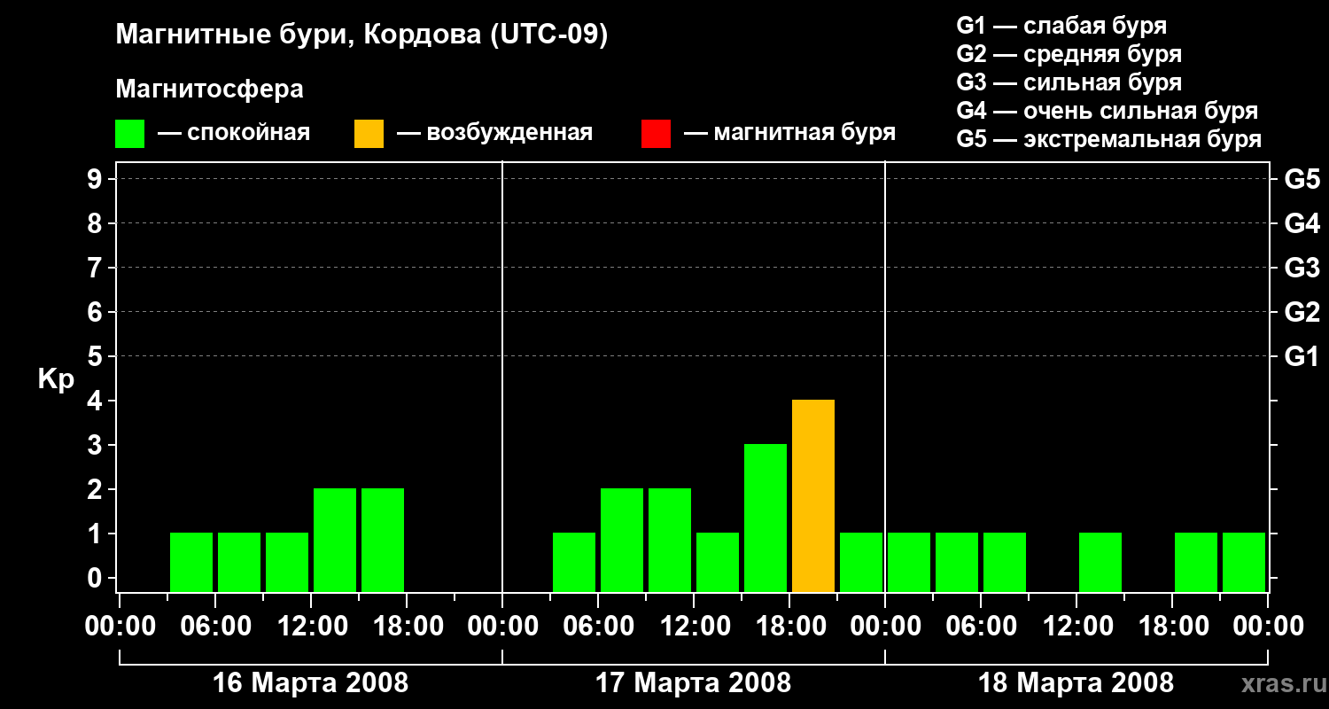 Изменения геомагнитного индекса Kp с 16 по 18 марта 2008 года для средних широт