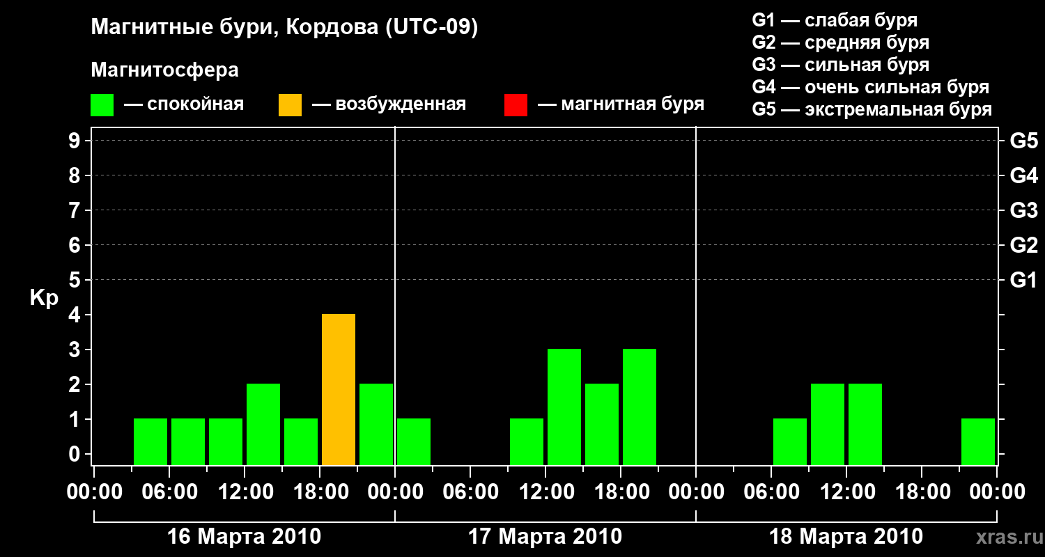 Изменения геомагнитного индекса Kp с 16 по 18 марта 2010 года для средних широт