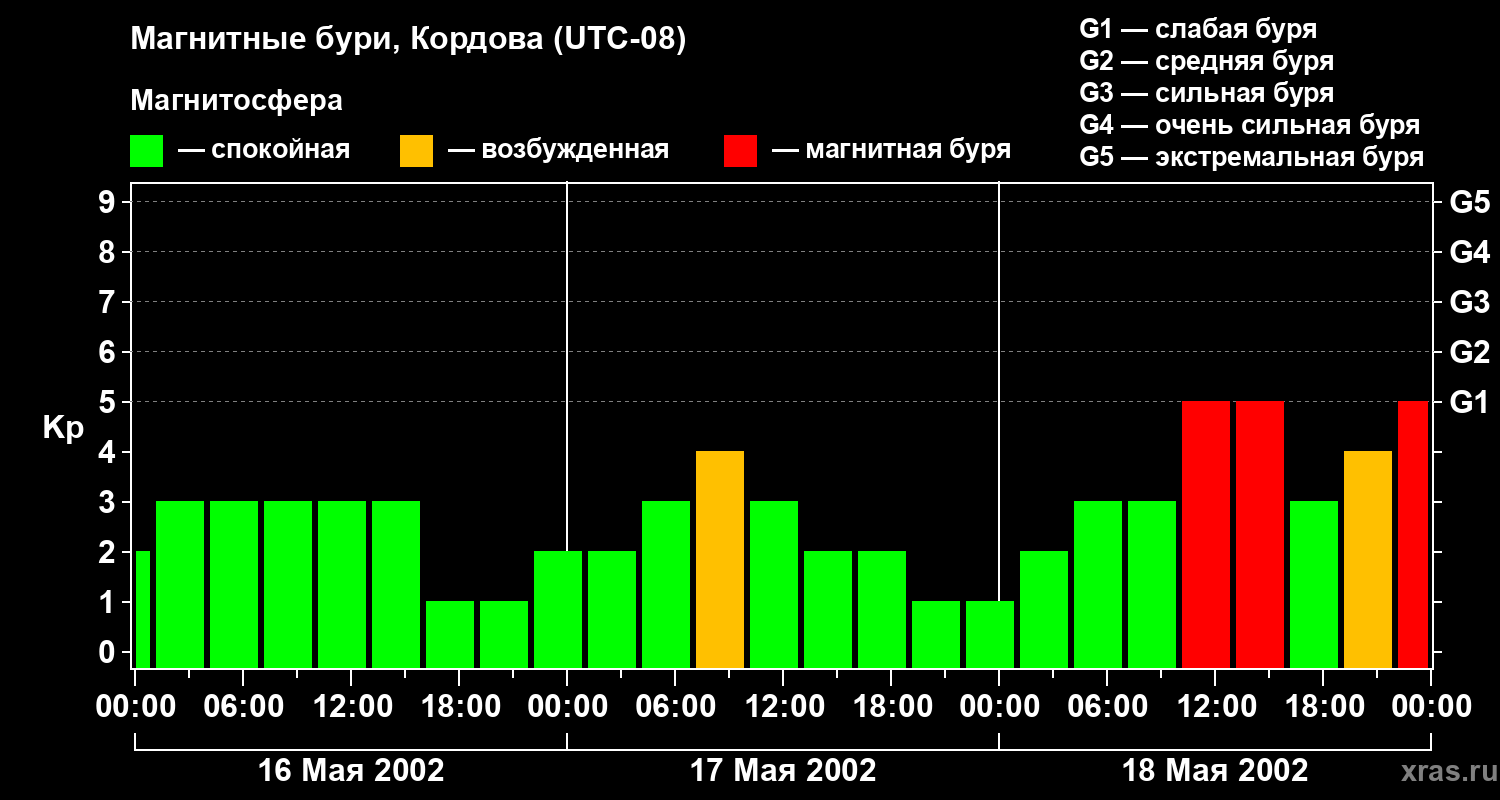 Изменения геомагнитного индекса Kp с 16 по 18 мая 2002 года для средних широт