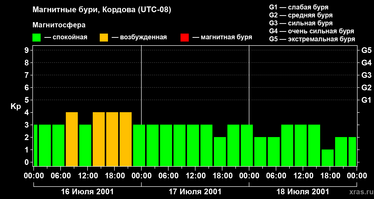 Изменения геомагнитного индекса Kp с 16 по 18 июля 2001 года для средних широт