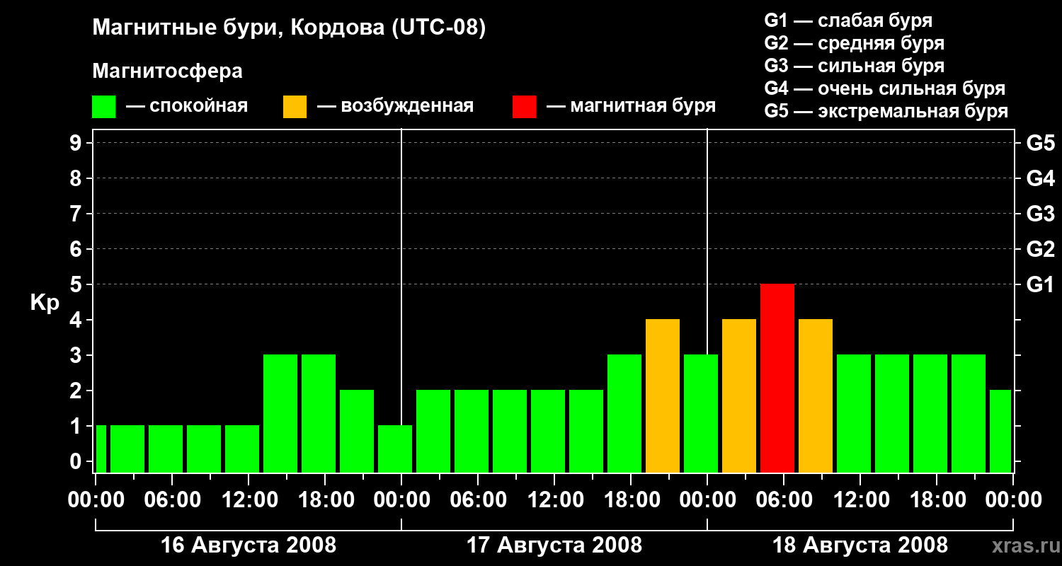 Изменения геомагнитного индекса Kp с 16 по 18 августа 2008 года для средних широт