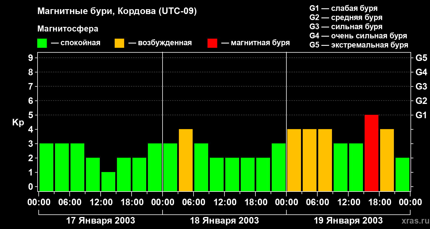 Изменения геомагнитного индекса Kp с 17 по 19 января 2003 года для средних широт