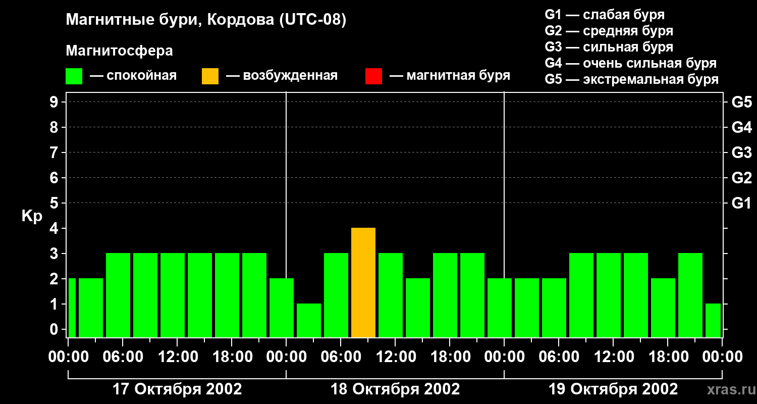 Изменения геомагнитного индекса Kp с 17 по 19 октября 2002 года для средних широт