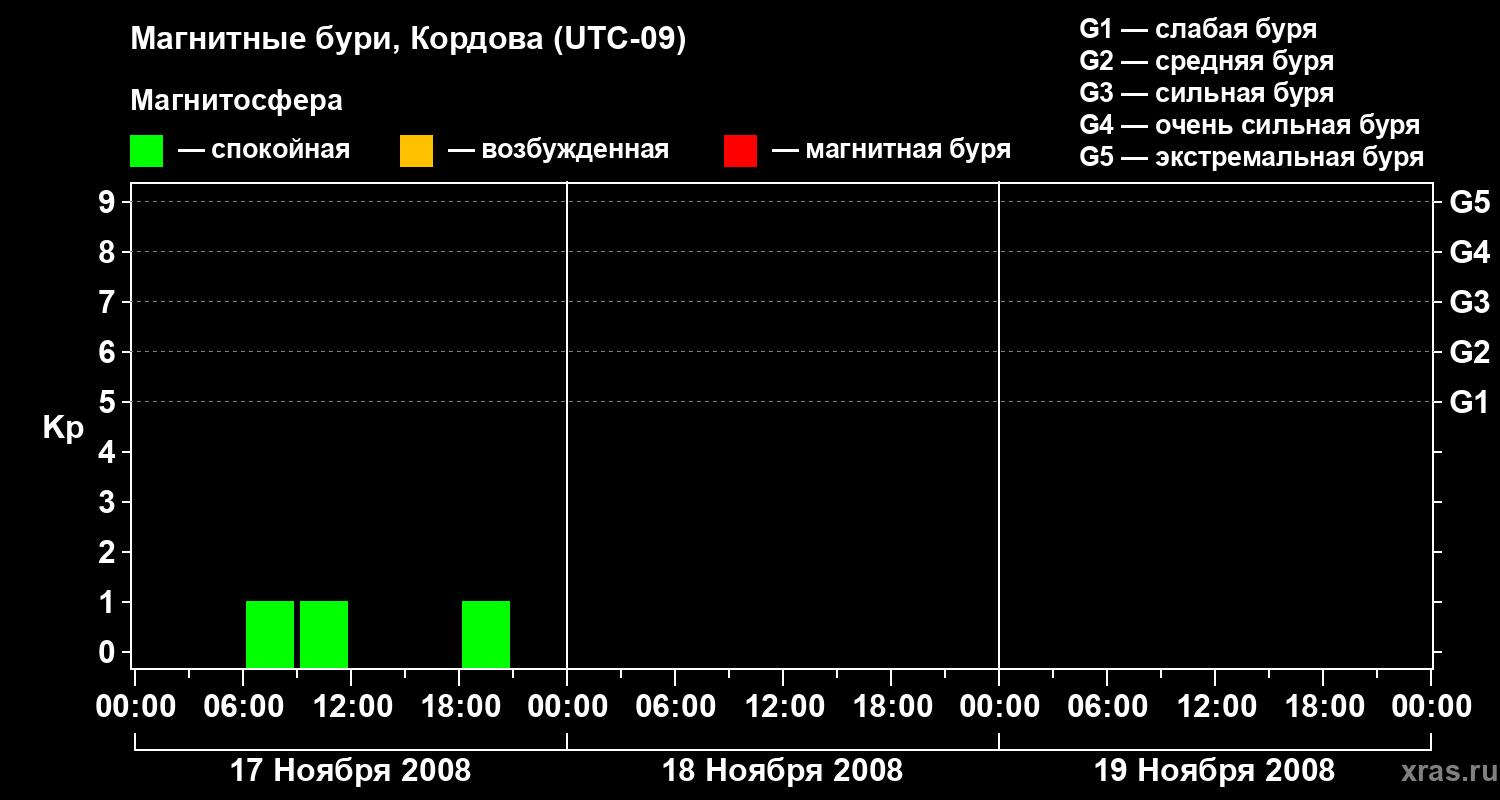 Изменения геомагнитного индекса Kp с 17 по 19 ноября 2008 года для средних широт