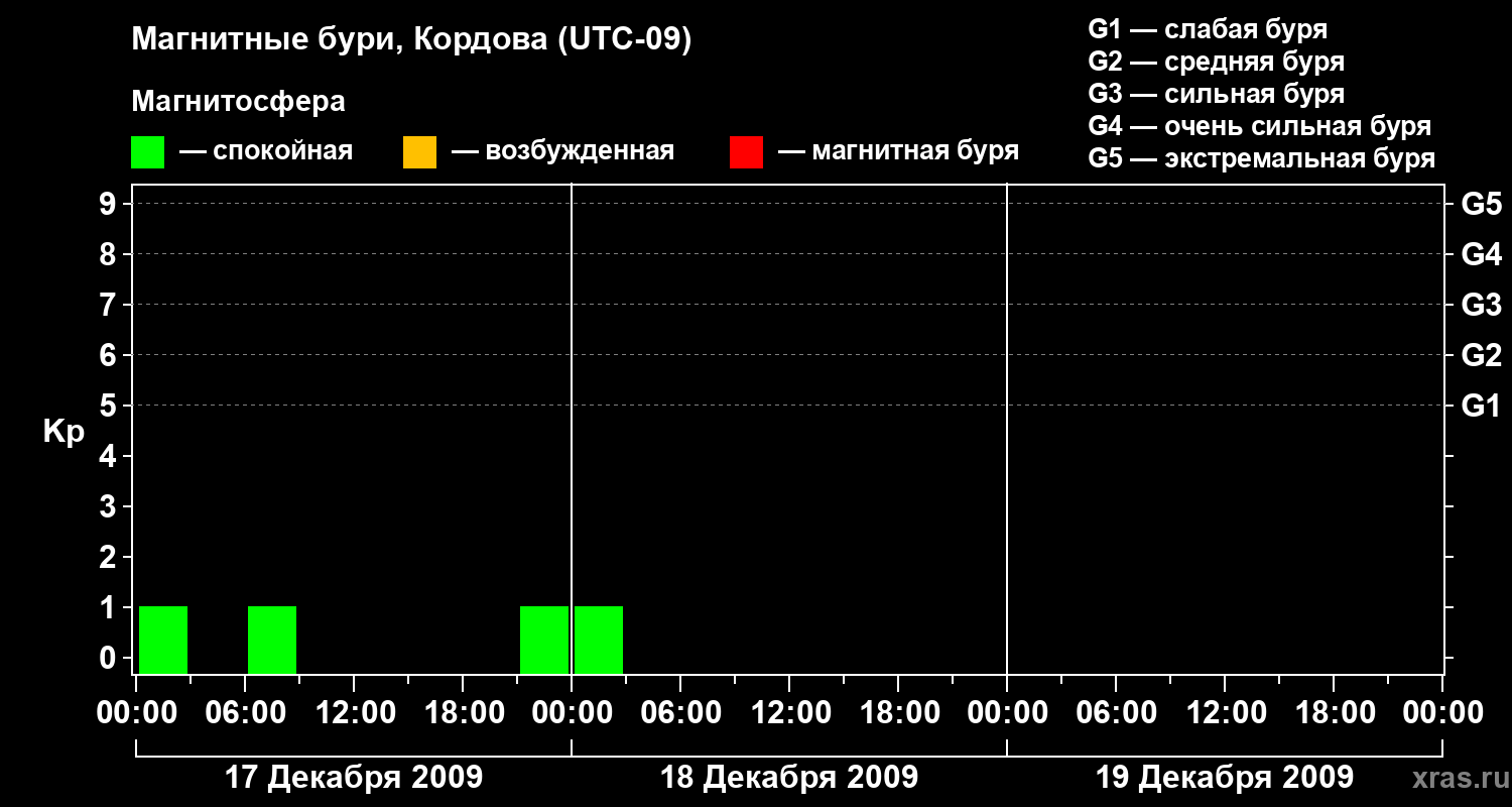 Изменения геомагнитного индекса Kp с 17 по 19 декабря 2009 года для средних широт