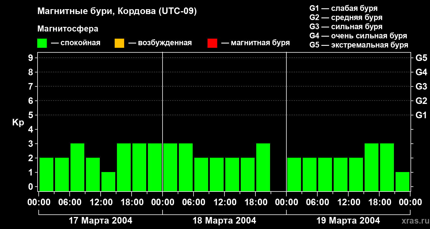 Изменения геомагнитного индекса Kp с 17 по 19 марта 2004 года для средних широт