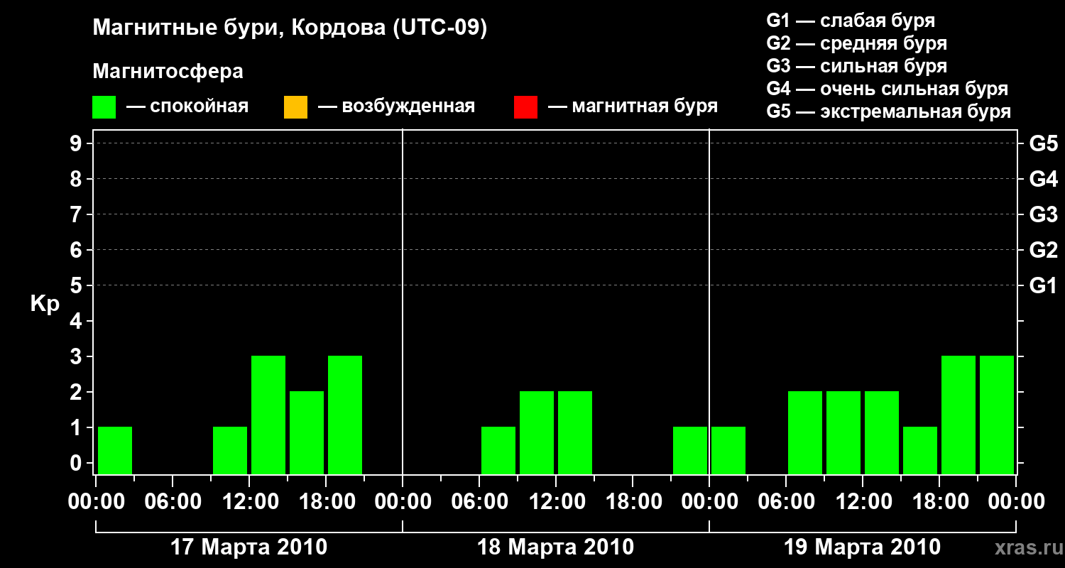 Изменения геомагнитного индекса Kp с 17 по 19 марта 2010 года для средних широт