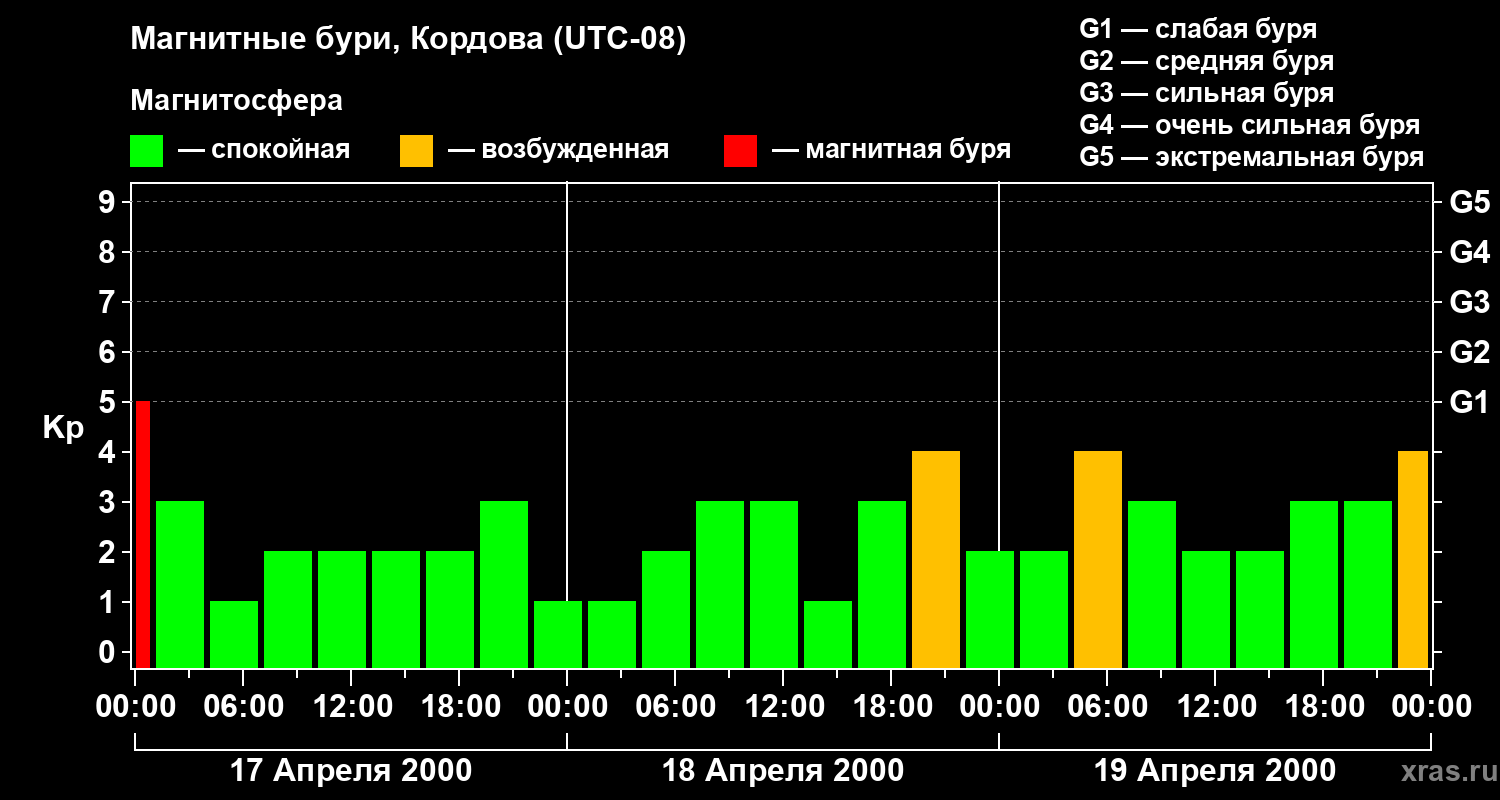 Изменения геомагнитного индекса Kp с 17 по 19 апреля 2000 года для средних широт