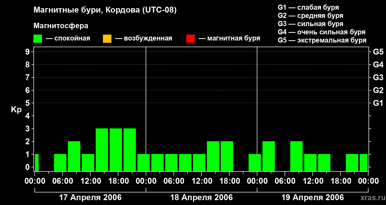 Изменения геомагнитного индекса Kp с 17 по 19 апреля 2006 года для средних широт