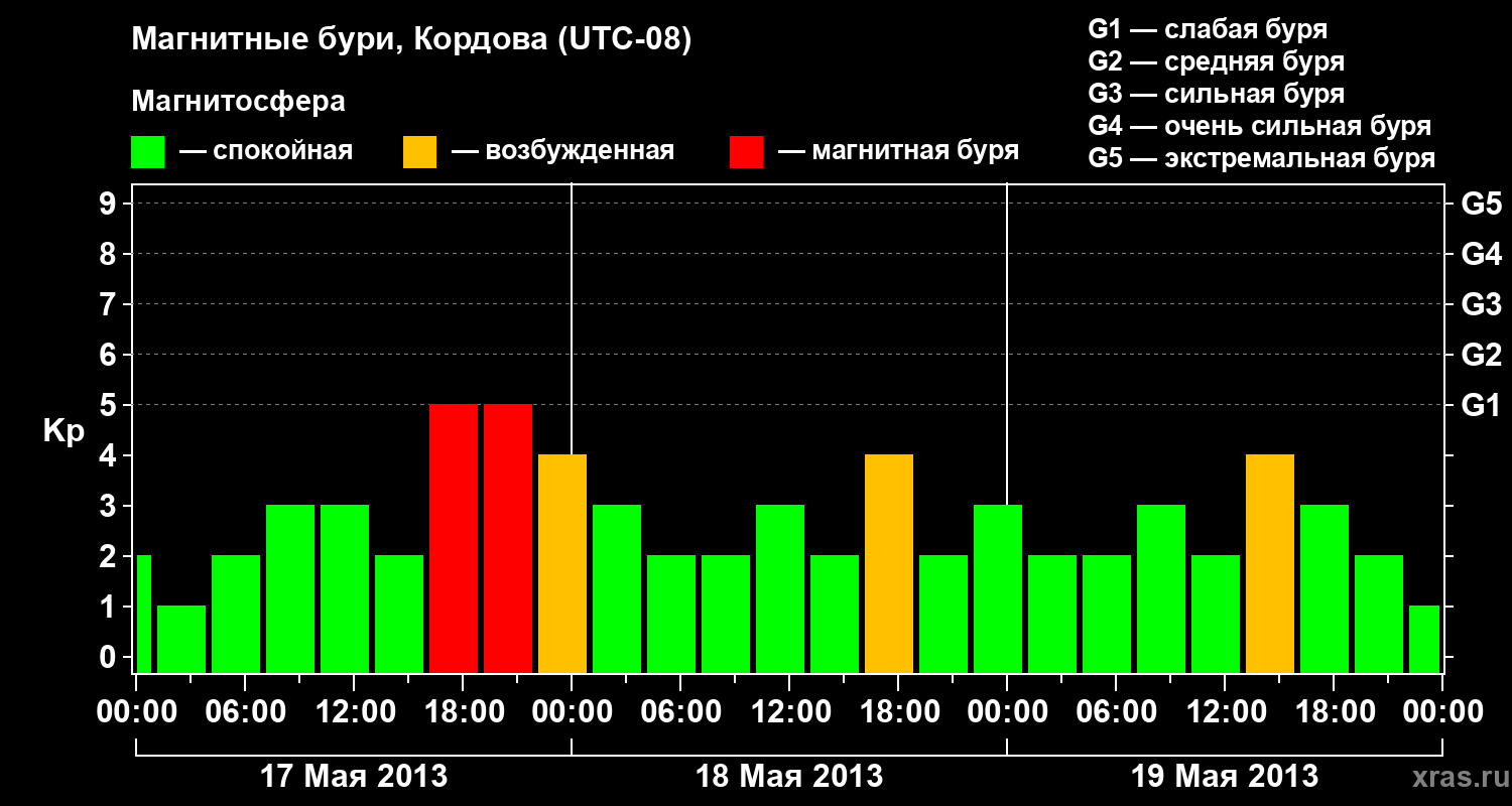 Изменения геомагнитного индекса Kp с 17 по 19 мая 2013 года для средних широт
