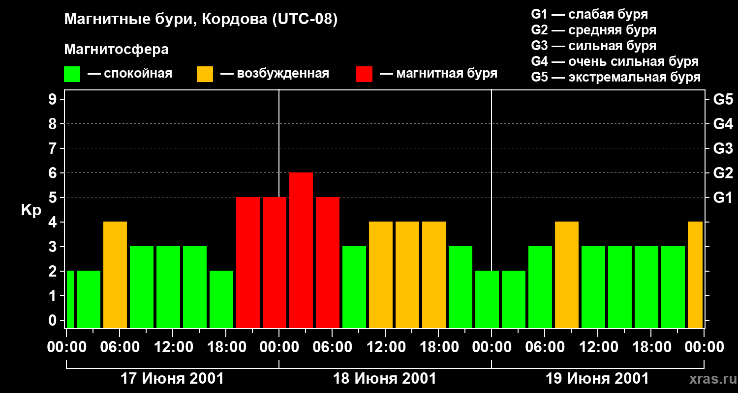 Изменения геомагнитного индекса Kp с 17 по 19 июня 2001 года для средних широт